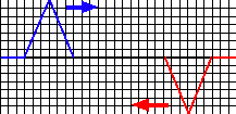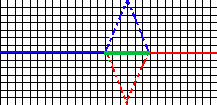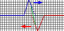 上図のように波は互いに影響し合います。波の山と谷がぶつかるとお互いに打ち消し合います。 図中では青波と赤波がぶつかった時にできる波を緑で書いています。