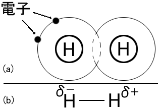 ここでは水素分子を例にとってみましょう。ご存じの通り水素分子は無極性分子です。 少しややこしい話になりますが、水素原子が共有結合をすると水素分子になります。 ここで、電子は共有されるのですが、電子はいつも二つの水素原子の中間にあるわけではありません。 電子は常に動き続けているのです。それでも、共有というくらいだから、水素原子の中間に 電子がある確率が高い(中間地点にいることが多い)のです。