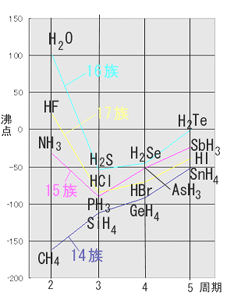 しかし、15〜17族元素では2周期の水素化合物の沸点が特に大きいです。