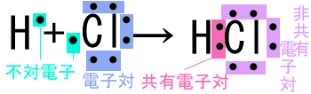 例えばイオン結合しているNaCl(塩化ナトリウム)は分子ではありません。共有結合をしているものは、 HCl(塩化水素)、CH4(メタン)、CO(一酸化炭素)、SO2(二酸化硫黄)、 CH3OH(メタノール)等があります。塩化水素の形成も上図の右側に示しておきます。 上の図を見てもらえばわかりますが、共有された電子対は共有電子対と呼ばれます。 また、共有されていない電子対は非共有電子対と呼ばれ、電子対になっていない単独の電子は 不対電子と呼ばれます。