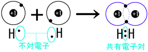 共有結合は非金属元素間に生じることが多い結合です。例えば水素分子H2で見てみると 水素原子は最外殻電子が1つなので、後一つ電子があると安定になります。 そこで水素原子はそれぞれの電子を一つ出し合い、それを共有します。 そうすることで最外殻電子の数を安定な8(水素は2)にします。 このように二つの原子が電子を共有する結合を共有結合といいます。また共有結合した原子団を分子といいます。
